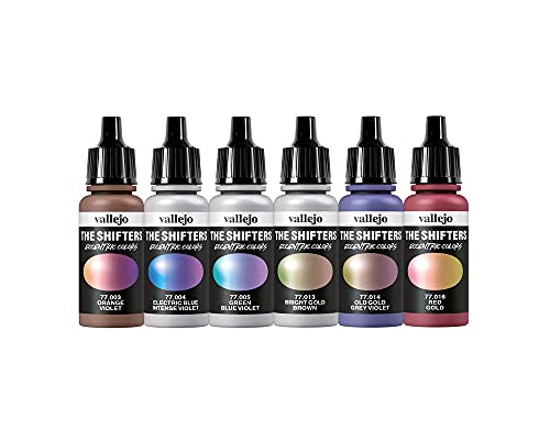 Verfset, 6 acrylverven voor de airbrush, produceren afhankelijk van de lichtinval andere tinten. Het beste op zwarte ondergrond in dunne laag aanbrengen.
